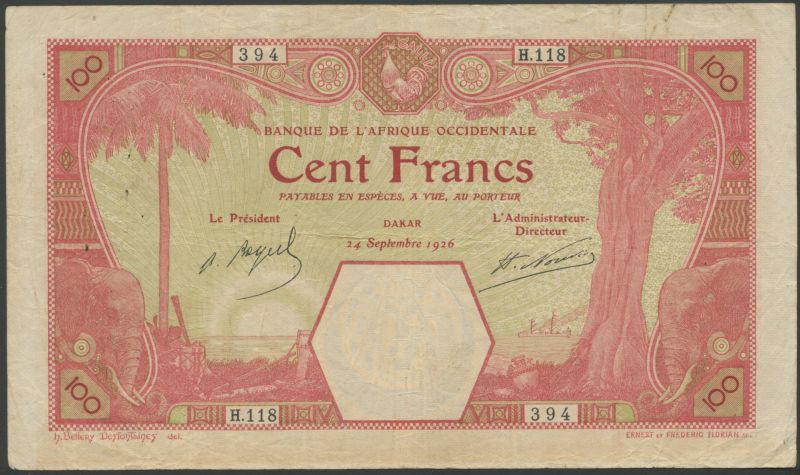(x) Banque De L'Afrique Occidentale (French West Africa), 100 francs, Dakar, 24 September 1926, serial number H.118-394, red and green, elephant and allegorical symbols at left and right, cock top centre, two printed signatures, reverse red-brown