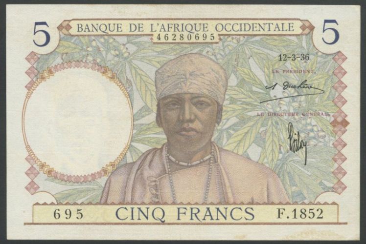 (x) Banque de l' Afrique Occidentale, French West Africa, 5 francs (6), 1935,1936,1937,1938,1939,1941, green and multicoloured, man at centre