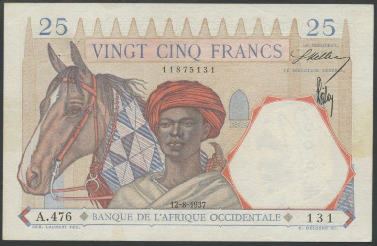 (x) Banque de l'Afrique Occidentale, French West Africa, 25 francs (4), 1936,1937,1938,1939, beige and multicoloured, man and horse at centre.