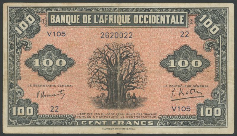 (x) Banque de l'Afrique Occidentale, French West Africa, 5 francs (2), Dated 14.12.1942, yellow-brown and black, girl on profile at centre, 25 francs (2), Dated 14.12.1942, green and black, woman at left and 100 francs, Dated 14.12.1942, pink and black, baobab tree at centre.