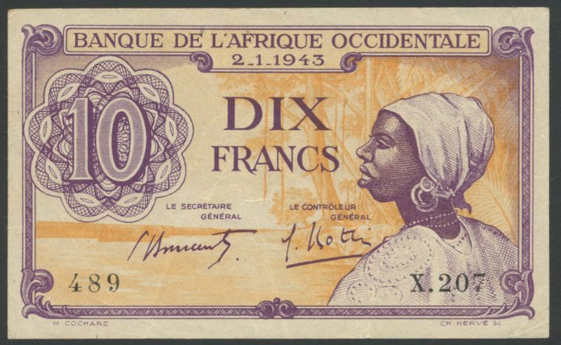 (x) Banque de l'Afrique Occidentale, French West Africa, 10 francs, 2 January 1943,serial number X.207-489, yellow-brown and violet, girl at right, value top left, reverse yellow-brown and violet, value at centre