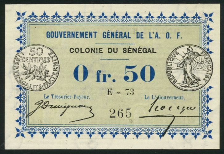 (x) Governement General de l'Afrique Occidentale Francaise, Colonie du Senegal, .50 franc, 11 February 1917, serial number E-73 265, blue on pale green, 50 centimes coin at left and right, COLONIE DU SENEGAL in black text at centre, reverse black and white, text
