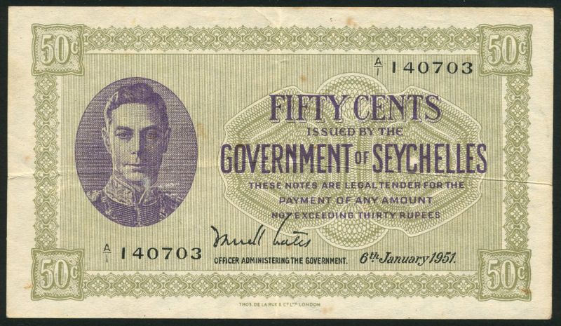(x) Government of the Seychelles, 50 cents, 6 January 1951, serial number A/1 140703, violet and pale green, George VI in oval frame at left, value at right and at each corner, reverse blank