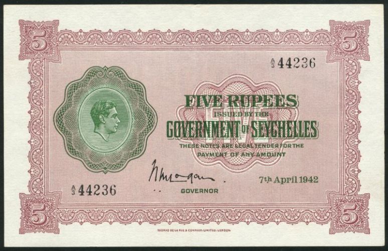 (x) Government of the Seychelles, 5 rupees, 7 April 1942, serial number A/3 44236, pink and dark green, head of George VI at left, Morgan signature