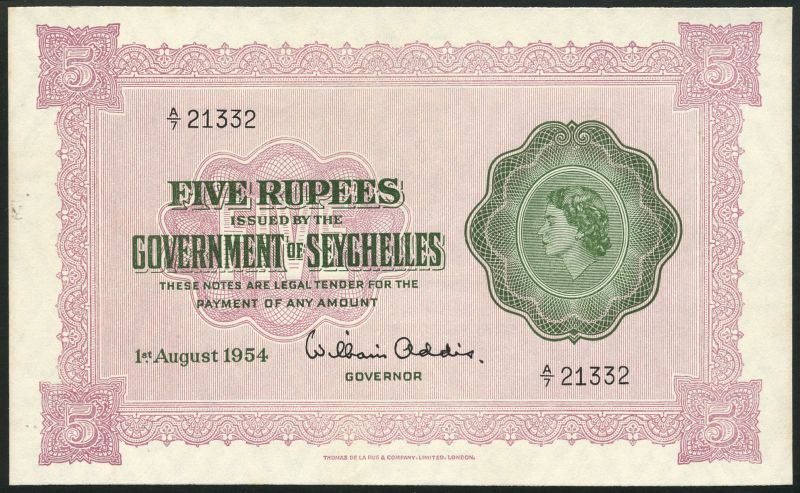 (x) Government of the Seychelles, 5 rupees, 1 August 1954, serial number A/7 21332, pink and dark green, head of Elizabeth II at left, Addis signature