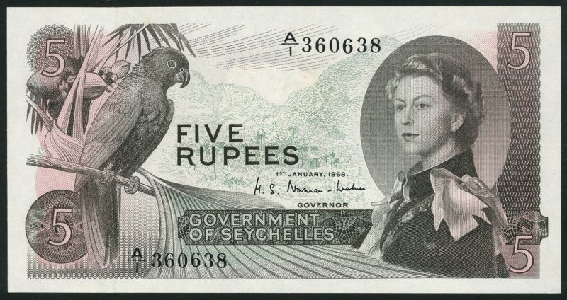 (x) Government of the Seychelles, 5 rupees, 1 January 1968, serial number A/1 360638, brown and grey-green, Elizabeth II at right, Seychelles Black Parrot at left, reverse brown and pink-red