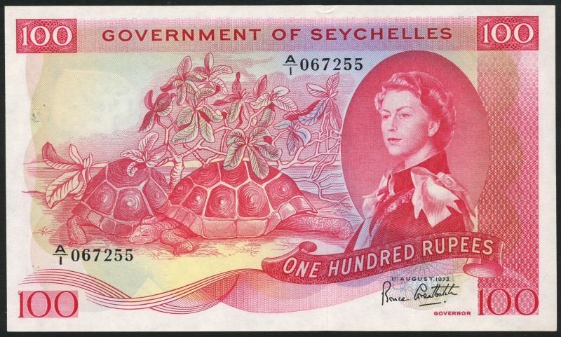 (x) Government of the Seychelles, 100 rupees, 1 August 1973, serial number A/1 067255, red and multicoloured, Elizabeth II at right, Land Turtles at left, value right centre and at each corner, reverse red and pale blue, value in field