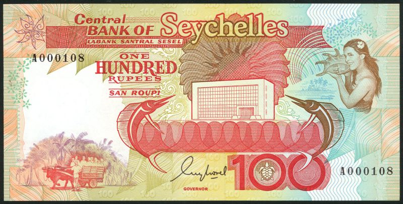 (x) Central Bank of the Seychelles, 10 rupees, serial number A 001938, multicoloured, 25 rupees, serial number A 000149, violet and multicoloured, 50 rupees, serial number A 000691, green and multicoloured and 100 rupees, serial number A 000108, red and multicoloured, all ND (1989), all with bank building at centre