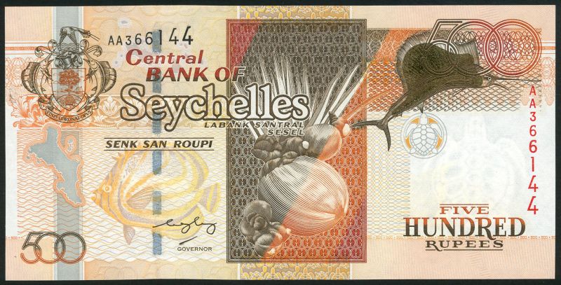 (x) Central Bank of the Seychelles, 10 rupees, serial number AA 080692,, green and blue, 25 rupees, serial number AA 466012, violet and multicoloured, 50 rupees, serial number AA 622017, green and multicoloured, 100 rupees, serial number AB 467645, red and multicoloured, also 500 rupees, serial number AA 366144, all ND (1989), all ND (1998), also 100 rupees, ND (2001), prefix AC with gold foil imprssion of sailfish top right