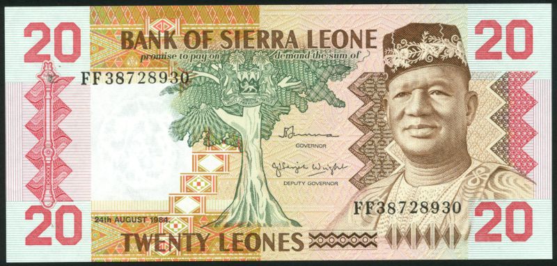 (x) Bank of Sierra Leone, a group of the 1974-82 Issues comprising 50 Cents (2), 1979, 1984, brown; 1 Leone, 1984, green; 2 Leones, 1984, red; 5 Leones, 1981, purple; 20 Leones, 1984, brown; also 1 July 1980 Commemorative Issue comprising 1 Leone, green; 2 Leones, red; 5 Leones, purple and 10 Leones, blue, all President Stevens at left or right