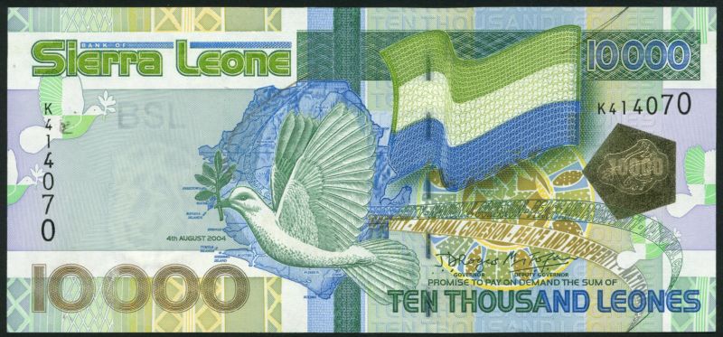 (x) Bank of Sierra Leone, a group of the 1988-93 Issues comprising 20 Leones, 1988, brown; 50 Leones, 1988, purple; 100 Leones, 1988, blue, 500 Leones, 1991, brown and green, all President Momoh at right; 500 Leones, 1998, green, Londo at right; 1000 Leones (2) 1993, 2002, multicoloured, Bai Bureh at right; 2000 Leones (2), brown and blue, Johnson at right; 5000 Leones (4), 1993, 1997, 2002, 2003, all Pieh at right; 10,000 Leones, 2004, green, dove at centre