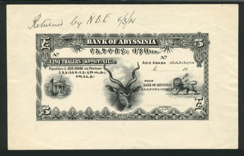 (x) Bank of Abyssinia a uniface die proof 5 thalers, ND (1914), no serial numbers, Greater Kudu at centre, bank building at left and Royal Lion of Judah at right