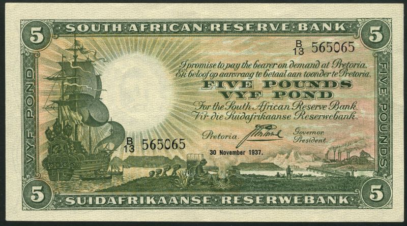 (x) South African Reserve Bank, £5, 30 November 1937, serial number B/13 565065, green and pale pink , galleon at left, allegorical scenes of South Africa in field, Postumus signature, reverse green, arms and value at centre