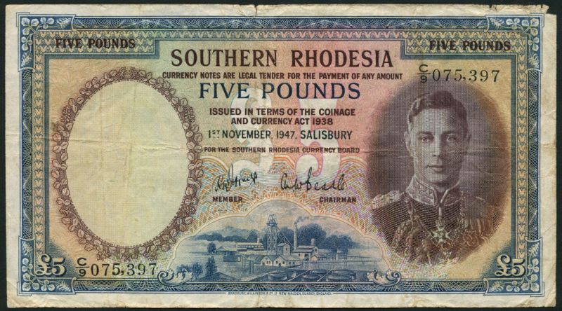 (x) Southern Rhodesia Currency Board, £5, 1 November 1947, serial number C/9 075,397, Greggs and Bessle signatures, blue, brown and multicoloured, portrait of King George VI at right, reverse Victoria Falls