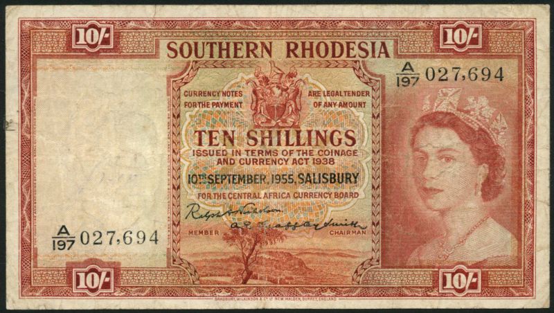 (x) Central Africa Currency Board, 10 Shillings, 10 September 1955, serial number A/197 027,694, Nicholson and Grafftey-Smith signatures, brown and multicoloured, portrait of Queen Elizabeth II at right, reverse Victoria Falls
