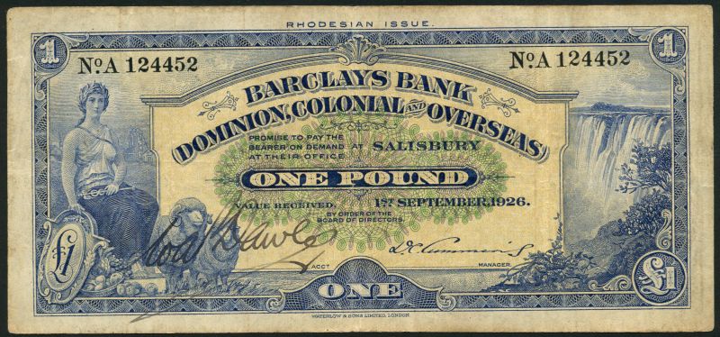(x) Barclays Bank (Dominion, Colonial and overseas), Rhodesia, £1, Salisbury, 17 September 1926, serial number A 124452, blue and pale yellow and lilac, maiden with shild and rams at left, falls at right, manuscript signature low left, printed signature low right, RHODESIAN ISSUE in top border, reverse blue and pale yellow, lion low centre