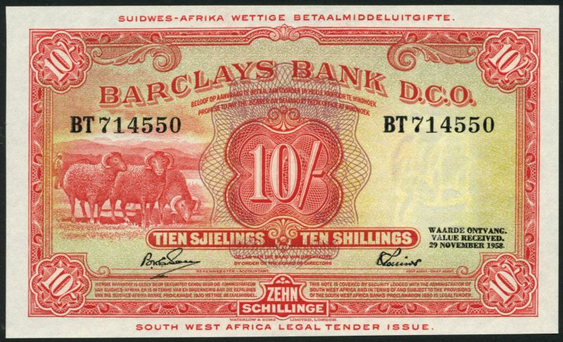 (x) Barclays Bank D.C.O., 10 Shillings, 29 November 1958, serial number BT714550, red on multicoloured underprint, sheep at left, value in guilloche at centre, reverse bank arms