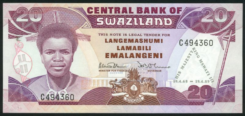 (x) Central Bank of Swaziland, 20 Emalangeni, ND (1986), purple; also a group of the ND (1987) Issue comprising 2 Emalangeni, brown;10 Emalangeni, blue; 20 Emalangeni, purple; also 20 Emalangeni, 19 April 1989, commemorative issue, violet, all King Maswati III at left