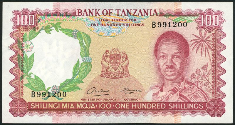 (x) Bank of Tanzania, 5 shillings, ND (1966), brown, 10 shillings (2), green, signatures 2 and 5, 20 shillings, signature 5, blue and 100 shillings, red, signature 1, all ND 91966), all President Nyerere at right
