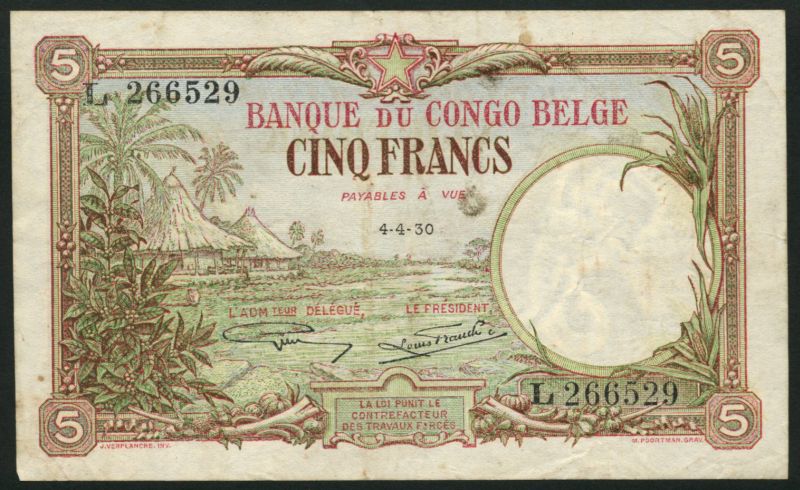 (x) Banque du Congo-Belge, 5 francs, no place nane, 4 April 1930, serial number L 266529, purple, pale green and pale blue, huts at left, star top centre, plants at left and right, reverse purple, pale green and pale blue, steamship right centre