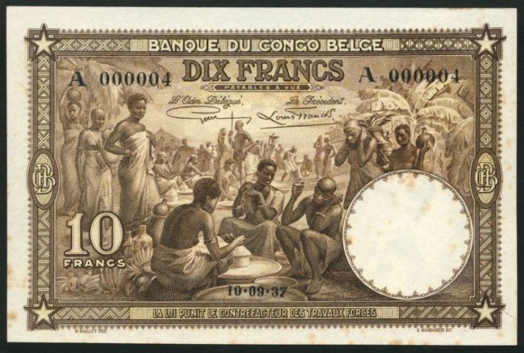 (x) Banque du Congo-Belge, 10 francs, 10 September 1937, serial number A 000004, dark and pale brown, market scene, value at left, star at each corner, two printed signatures top centre, reverse dark and light brown, waterbuck at centre, value low right, star at each corner