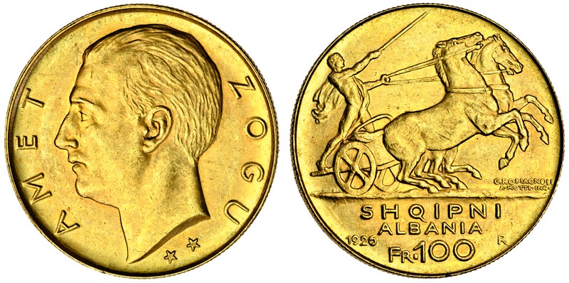 (g) Albania, Zog (president 1925, king 1928-39), Rome, 100-Franga Ari, 1926 R, head left, rev. chariot (F.1; KM.11.3), good very fine