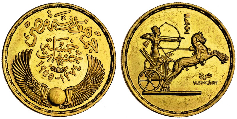 (g) Egypt, First Republic (1953-58), 5-Pounds, 1955 /AH1374, third anniversary of the Revolution, winged symbol with legend above, rev. charioteer shooting an arrow right (KM.388), scuff marks in fields, about uncirculated