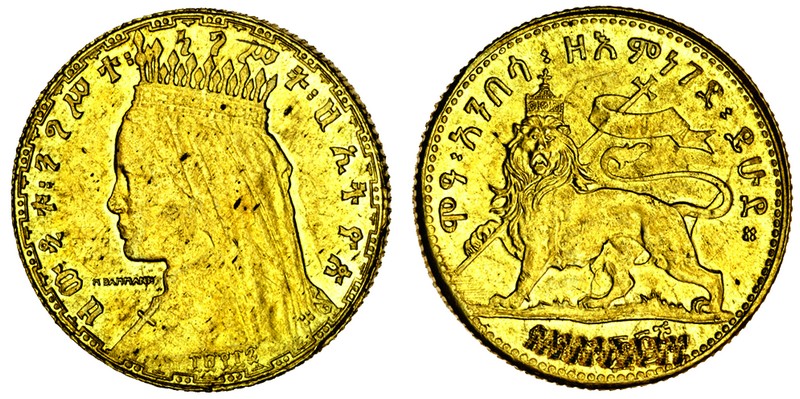 (x) Ethiopia, Empress Zauditu (1917-30), gold presentation 1/8 Birr (One Werk) without denomination, 20mm., 5.57g, EE 1917, crowned bust left, Ethiopian date on shoulder, rev. Lion of Judah, denomination officially effaced, reeded edge (F.25; Gill p.127; Y.21), very fine, rare