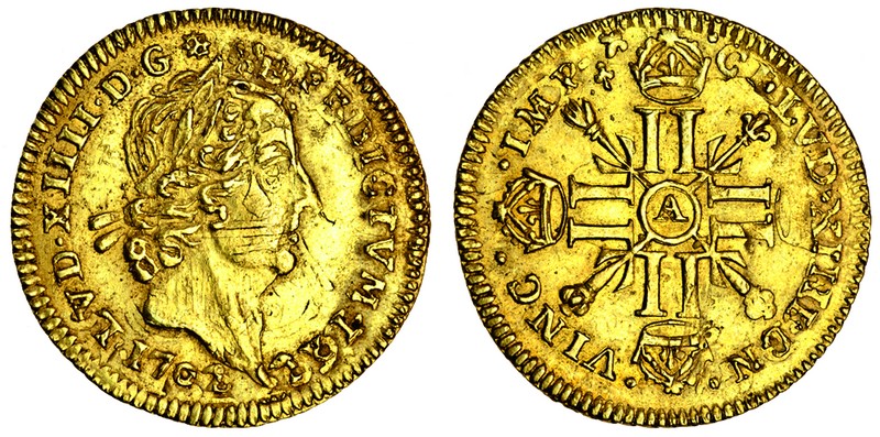 (x) France, Louis XIV (1643-1715), Paris, Demi Louis d'or aux huit L et aux insignes, 3.33g, 1702 A, laureate head right, rev. eight crowned Ls cruciform, sceptres in angles, reformation with the undertype prominent (Dr.248; Dup.1444A; F.437; KM.332.1), good very fine