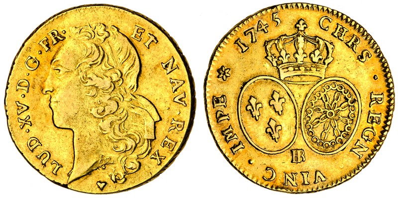 (x) France, Louis XV (1715-74), Strasbourg, Double Louis d'or au bandeau, 16.19g, 1745 BB, head left, rev. crown over two oval shields (Dr.518; Dup.1642; F.463; KM.519.4), edge rubbed from a mount, very fine