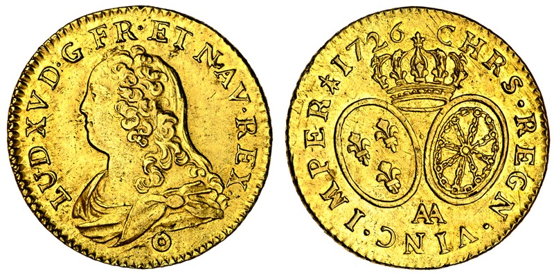 (x) France, Louis XV (1715-74), Metz, Louis d'or aux lunettes, 8.15g, 1726 AA, draped bust left, millstone below, rev. crown over two oval shields (Dr.516; Dup.1640; F.-; KM.489.2), extremely fine