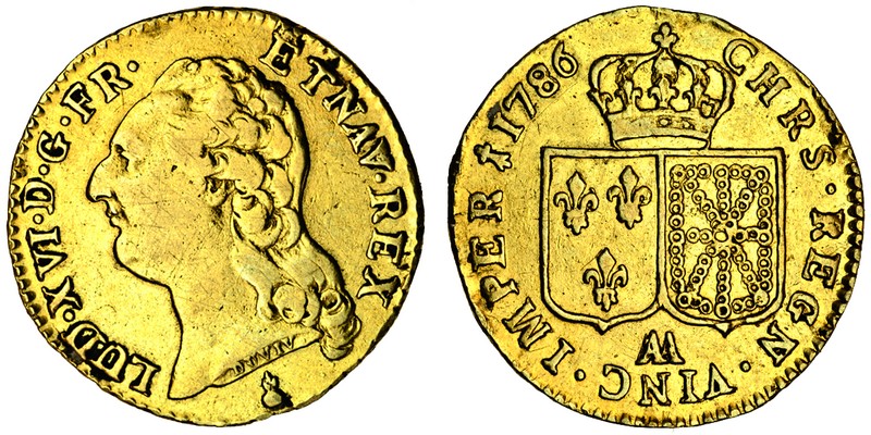 (x) France, Louis XVI (1774-92), Metz, Louis d'or à la tête nue, 7.53g, 1786 AA, head left, rev. crown over two square shields (Dr.605; Dup.1707; F.475; KM.591.2), edge damage from a mount, good fine