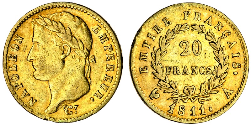 (g) France, Napoleon, Emperor (1804-14), Paris, 20-Francs, 1811 A, laureate head left, rev. value in wreath (F.511; KM.695.1), some marks on edge, very fine