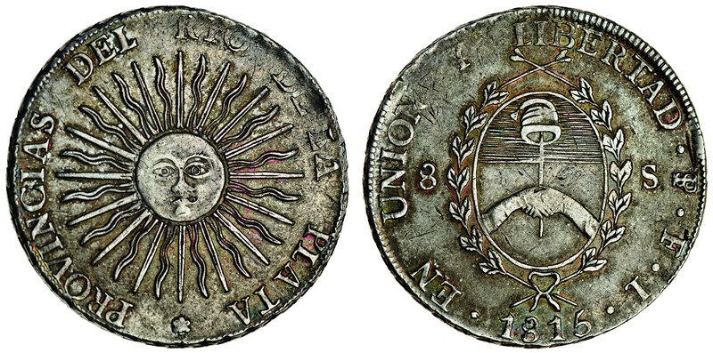 Argentina, Provincias del Rio de la Plata, Potosi, 8-Soles, 1815 FL, sun with face, rev. arms in wreath dividing value, date below (KM.15), very fine