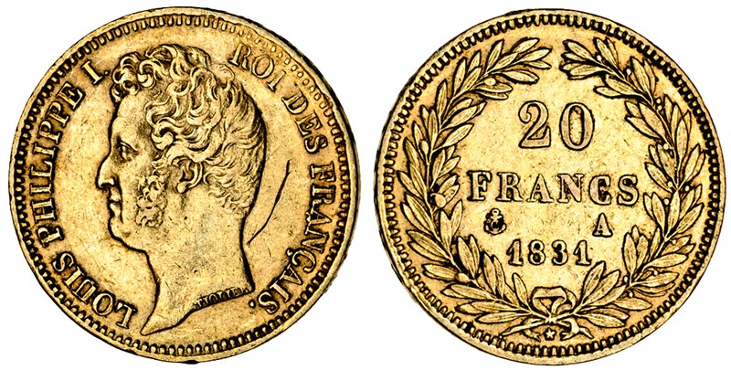 (g) France, Louis Philippe I (1830-48), Paris, 20-Francs, 1831 A, head left, rev. value in wreath (F.553; KM.746.10, scratch behind head, otherwise very fine