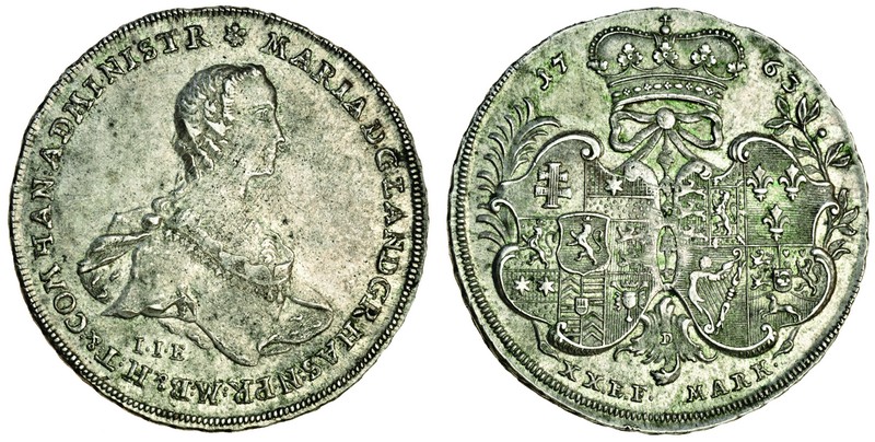 Germany, Hanau-Münzenberg, Wilhelm IX of Hesse-Cassel under regency of Mary of England (1760-64), Half-Taler or 20-Mark, 1763, bust of Maria right, signed I.I.E. below, rev. two crowned shields, D below (for Charlotte Rebecca Damiset) (Hoff.5021; KM.91; Schütz 2039), very fine