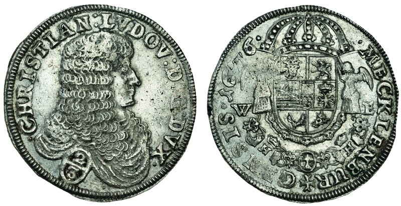 Germany, Mecklenburg-Schwerin, Christian Ludwig I (1658-92), 2/3-Taler (Gulden), 1676 we, draped bust right, value below, rev. crowned arms dividing initials, date to left of crown (KM.A106), good very fine