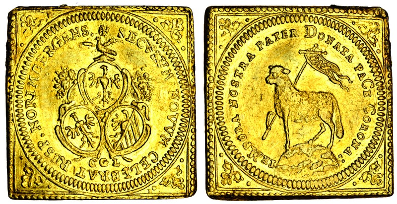 (x) Germany, Nürnberg, square Ducat, 3.41g, 1700 cgl, three shields, rev. lamb and flag on globe (F.1886; Kellner 73; KM.258), from a mount, good fine