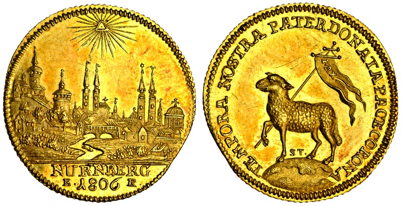 (x) Germany, Nürnberg, round Ducat, 3.50g, 1806, to commemorate the Peace of Pressburg, city view, nurnberg and date dividing E-R below, rev. tempora nostra pater donata pace corona, lamb, standing on globe, holding flag on which pax, st below lamb (Divo/S.152; F.1919; KM.416; Schl.516), attractive extremely fine