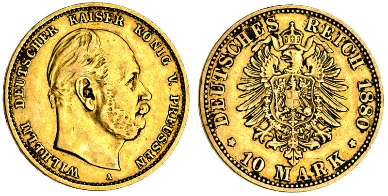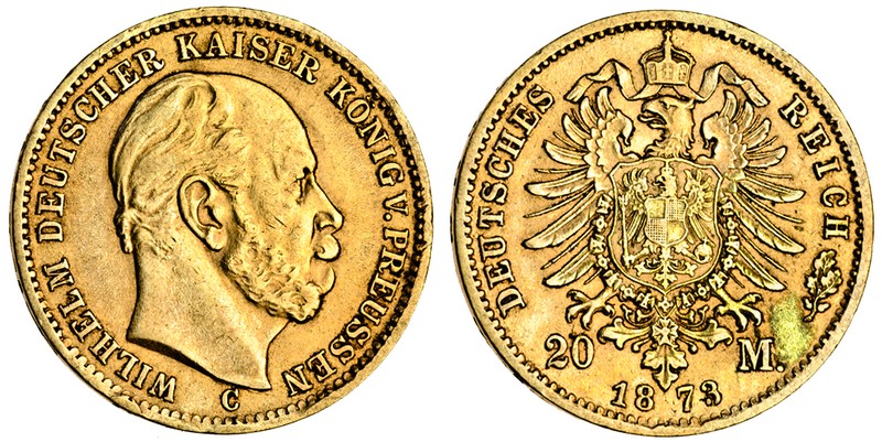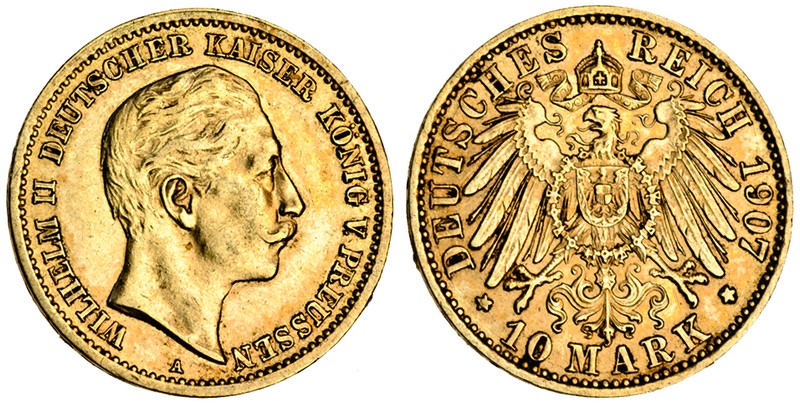 (g) Germany, Prussia, Wilhelm I (1861-88), 20-Marks, 1863 C, Frankfurt, head right, rev. eagle (F.3815; KM.501), 10-Marks, 1880 A, Berlin; Wilhelm II, 10-Marks, 1907 A, average very fine (3)
