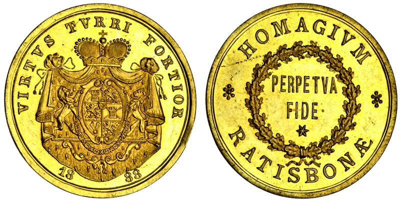 (x) Germany, Thurn und Taxis, Albert (1885-1952), medallic Ducat, 3.86g, 1888, virtvs tvrri fortior, crowned arms, as on the Ducat of 1734 struck for Anselm Franz, rev. homagivm ratisbonae around perpetva fide in wreath (F.3391 for Ducat of 1734; cf. slg. Wurster 33), proof like, uncirculated
