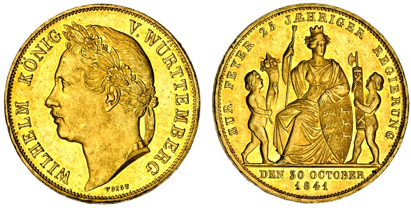 (x) Germany, Württemberg, Wilhelm I (1816-64), 4-Ducats, 13.95g, 1841, laureate head left, rev. female allegorical figure seated with children holding cornucopia and fasces (AKS.119; F.3615; Schl.925), extremely fine