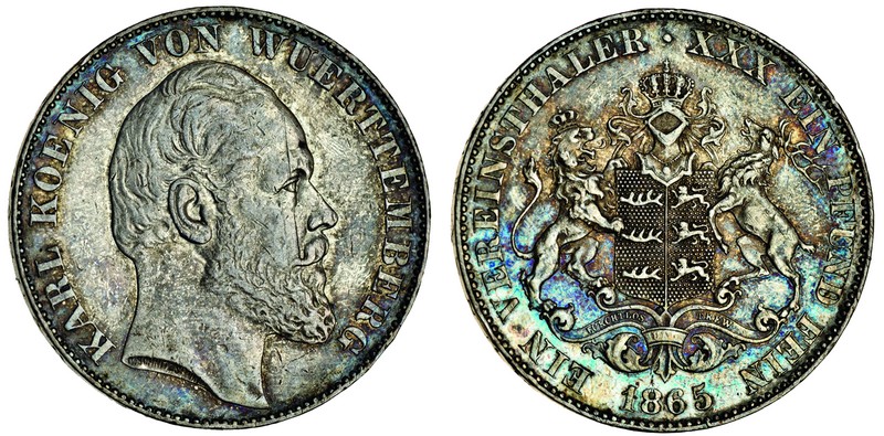 Germany, Württemberg, Karl (1864-91), Taler, 1865, head right, rev. arms (AKS.126; J.85a; KM.614), scratch on face otherwise very fine
