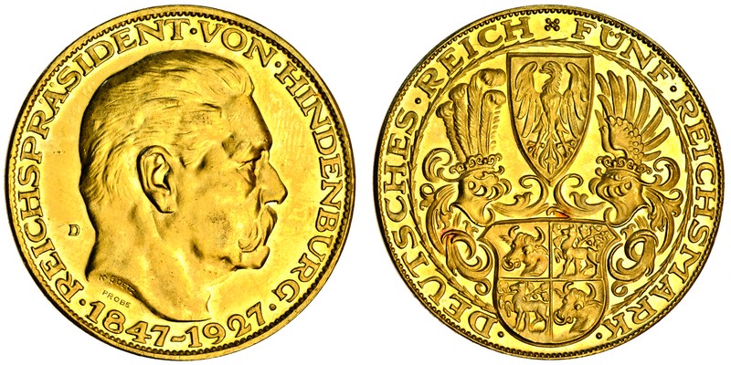 (x) Germany, Munich, Reichspräsidenten Paul von Hindenburg, gold medal on his 80th birthday, 1847-1927, 19.82g, head right, rev. shields and helms, bayer. hauptmünzamt 985f on edge (Kienast 386; Schl.14 var.), uncirculated