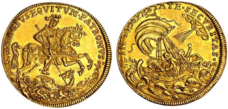 (x) Hungary, Kremnitz, medallic 5-Ducats, 17.42g, undated, by Christian Herman Roth (1645-90), s: georgivs eqvitvm patronvs, St George, on horseback right, slaying the dragon, signed c.h.r. below, rev. in tempestate* secvritas*, Christ asleep in the boat on Lake Galilee (F.563), marks on edge, good very fine, scarce