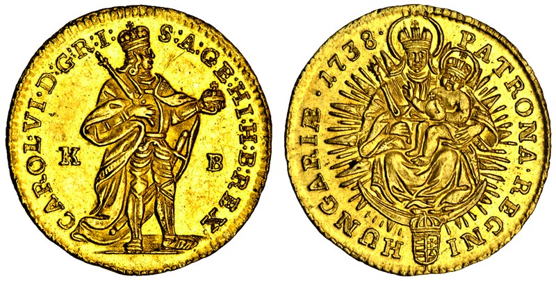 (x) Hungary, Charles III (Charles VI of Austria) (1711-40), Kremnitz, Ducat, 3.48g, 1738, carol. vi. d:g: r:i: - s:a: ge: hi: h: b: rex., ruler standing, holding orb and sceptre, dividing k-b, rev. patrona. regni - hungariae. 1730., Madonna and Child in glory, on crescent moon, shield below (AHL.238; F.171; Huszár 1585; KM.306.2), extremely fine