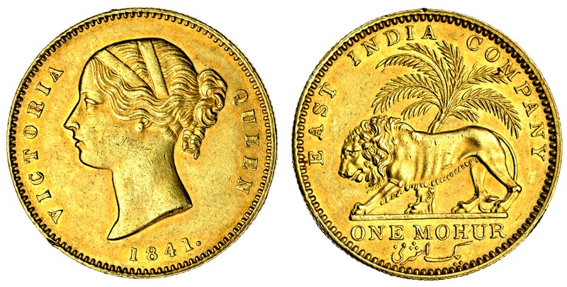 (g) India, Victoria (1837-1901), Mohur, 1841, young head left, WW incuse on truncation, divided legend above, small date below, rev. lion walking left, palm tree behind (F.1595a; KM.462.3), small marks on edge, very fine