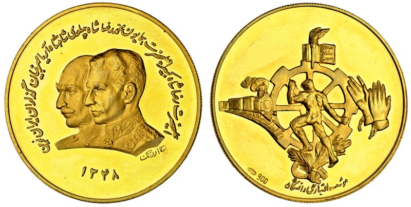 Iran, Mohammad Reza Shah (1941-79), proof gold medal, Achievements of the dynasty, SH1348 (1969), busts of the Shah and his father left, rev. Industry, Agriculture, Learning and Freedom, 25.00g, extremely fine