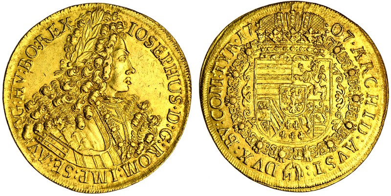 (x) Austria, Joseph I (1705-11), Hall, 10-Ducats, 34.74g, 1707, iosephus. d:g: rom: imp: se: avg: hv: bo: rex., laureate and cuirassed bust right wearing Collar of the Golden Fleece, rev. archid; avst: dvx: bv: com: tyr, crowned arms within Collar of the Golden Fleece (AHL-; F.-; KM.-), some scuff marks, good very fine, very rare