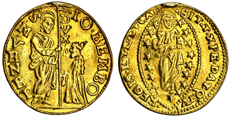 (x) Italy, Venice, Giovanni Bembo (1615-18), Zecchino, 3.46g, io. bembo s. m. venet, St Mark handing standard to Doge, who kneels before him, rev. sit. t. xpe. dat. q. tv. regis. iste. dvcat., Christ in mandorla, seventeen stars around (CNI.46/59-67; F.1284; P.1), from a mount, very fine, rare